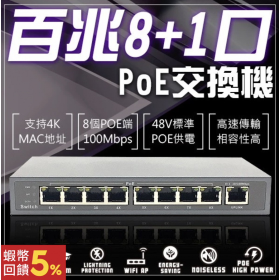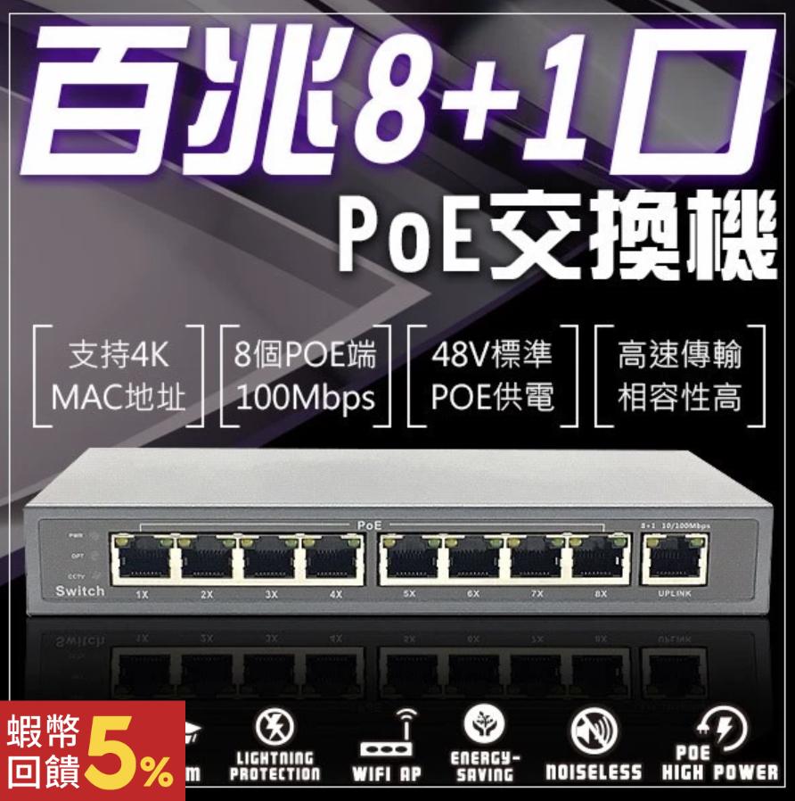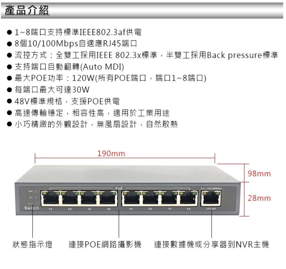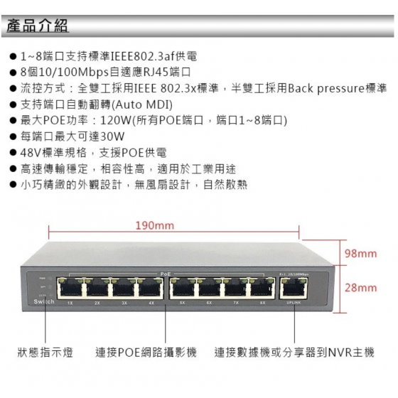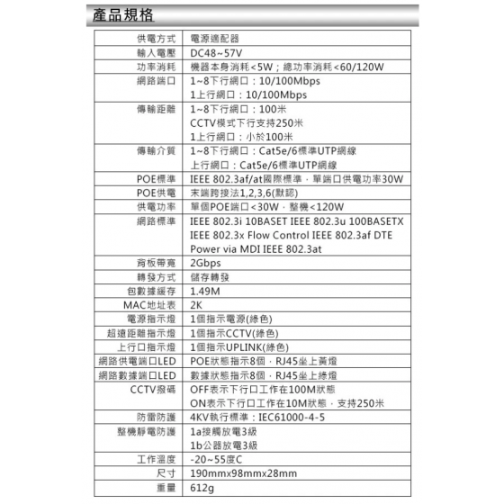 *PoE功率:120W(1~8端口最大總輸出功率由電源供應器決定,最大可達120W)