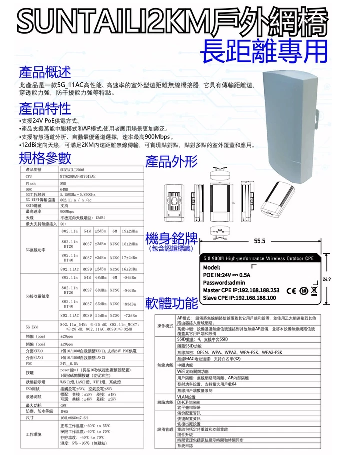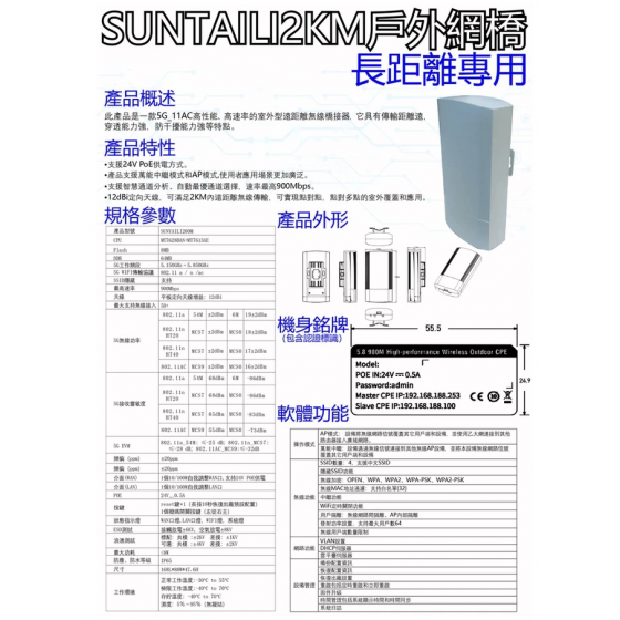 此產品是一款5G_11AC高性能、高速率的室外型遠距離無線橋接器,它具有傳輸距離遠,