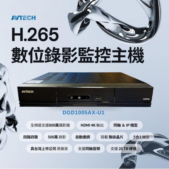 【AVTECH DGD1005AX(US)-U1】H.265 五合一 4/8/16 路 XVR 錄影主機|支援4K HDMI輸出|遠端監控App支援|20TB大容量擴充