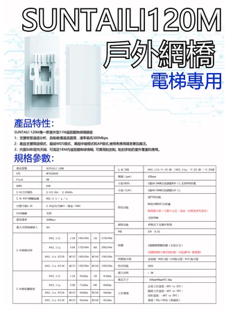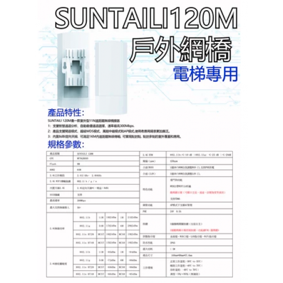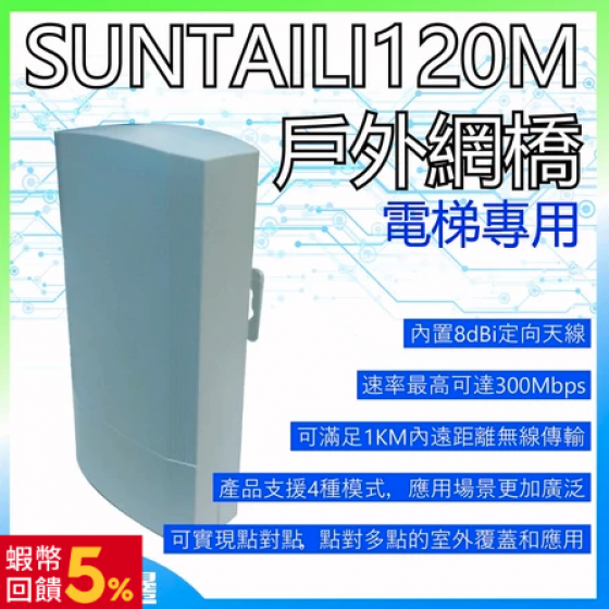 1:支援智慧通道分析、自動最優通道選擇,速率最高300Mbps. SUNTAILI 120M是一款室外型11N遠距離無線橋接器。