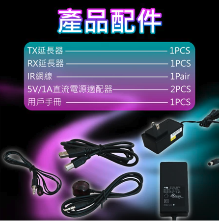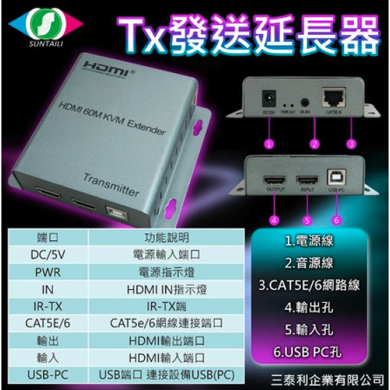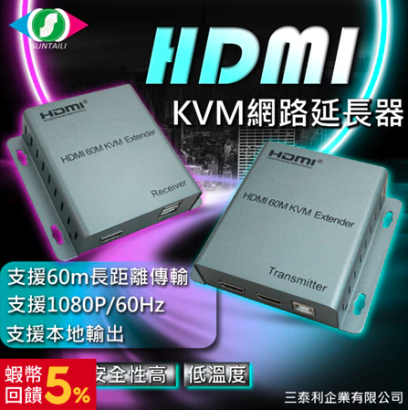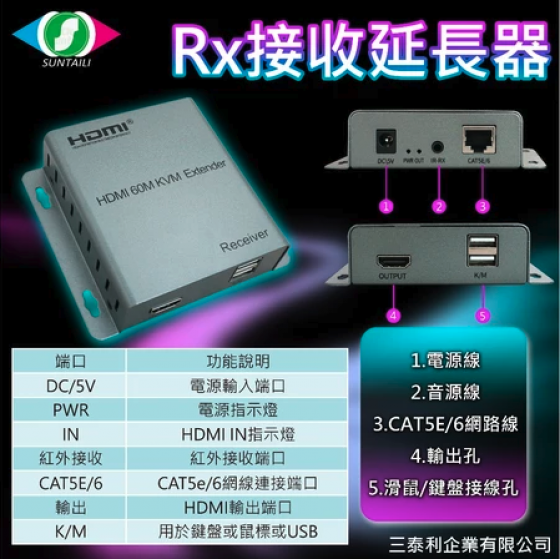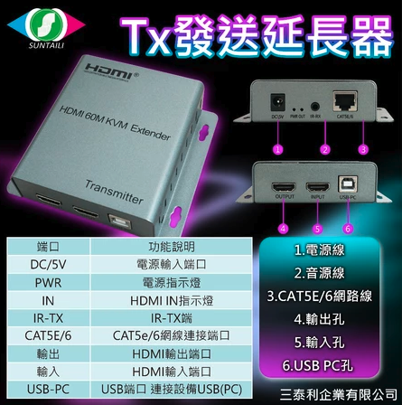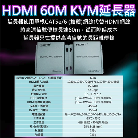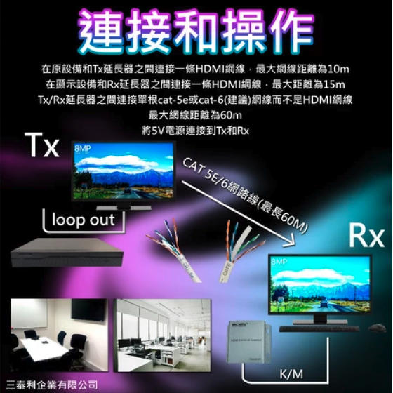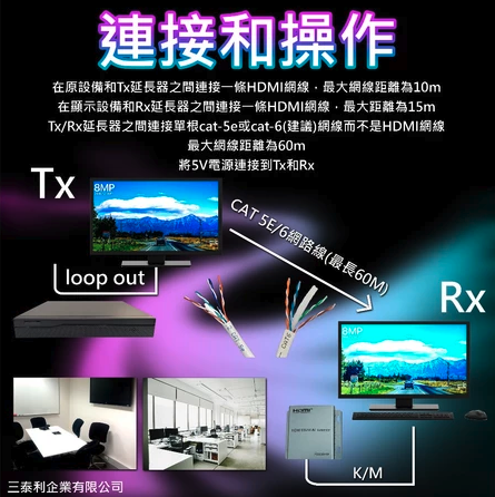 Tx/Rx延長器之間連接單根cat-5e或cat-6(建議)網線而不是HDMI網線,最大網線距離為60m