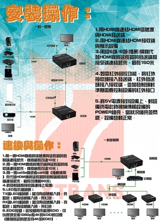 3.用超5類/6類(推薦)網線代替HDMI線將延長器的發送端和接受端連結起來,最長150米。