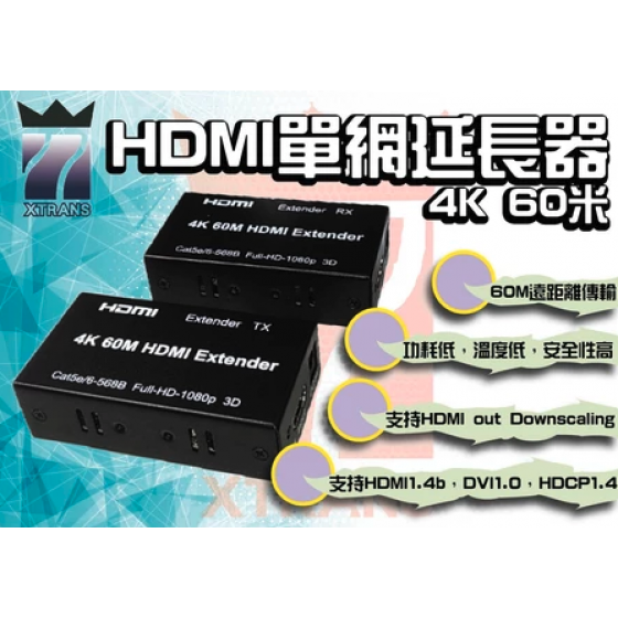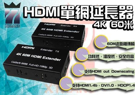這款單網延長器通過一根CAT5e或者CAT6線(推薦使用)替代HDMI線,並且可以將HDMI信號延長傳輸60米,降低了成本,延長器的目的就是為了以低成本的線材來實現長距離的信號傳輸。
